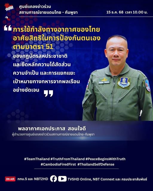 "การใช้กำลังทางอากาศของไทย อาศัยสิทธิในการป้องกันตนเองตามมาตรา ๕๑ ของกฎบัตรสหประชาชาติ และยึดหลักความได้สัดส่วน ความจำเป็น และการแยกแยะเป้าหมายทางทหารจากพลเรือนอย่างชัดเจน"